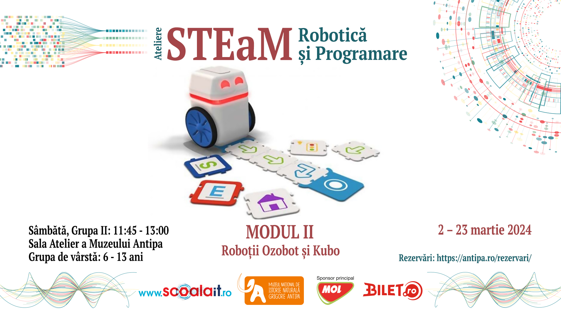 Muzeul Național de Istorie Naturală „Grigore Antipa” și www. ȘcoalaIT.ro vă invită să îi aduceți pe cei mici la atelierele STEaM de Robotică și Programare. În cadrul acestui atelier copiii vor experimenta lucrul cu piese robotice, accesorii și subansambluri robotice. La fiecare lecție au ocazia de a afla lucruri noi din istorie, fizică, chimie, biologie, totul într-o formă interactivă, alături de roboții modulari Fable de la Shape Robotics.