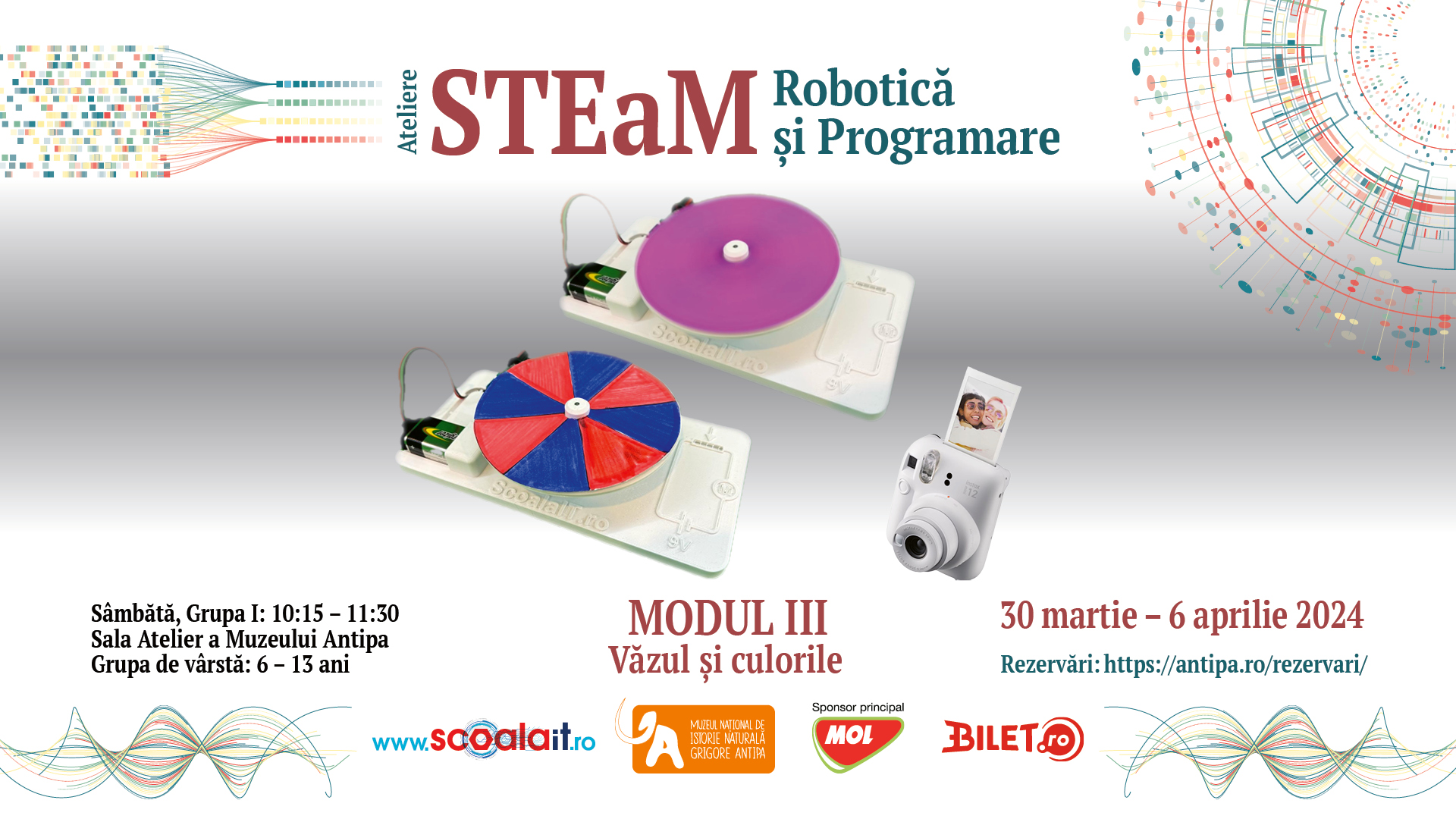 Muzeul Național de Istorie Naturală „Grigore Antipa” și www. ȘcoalaIT.ro vă invită să îi aduceți pe cei mici la atelierele STEaM de Robotică și Programare. În cadrul acestui atelier copiii vor experimenta lucrul cu piese robotice, accesorii și subansambluri robotice. La fiecare lecție au ocazia de a afla lucruri noi din istorie, fizică, chimie, biologie, totul într-o formă interactivă, alături de roboții modulari Fable de la Shape Robotics.
