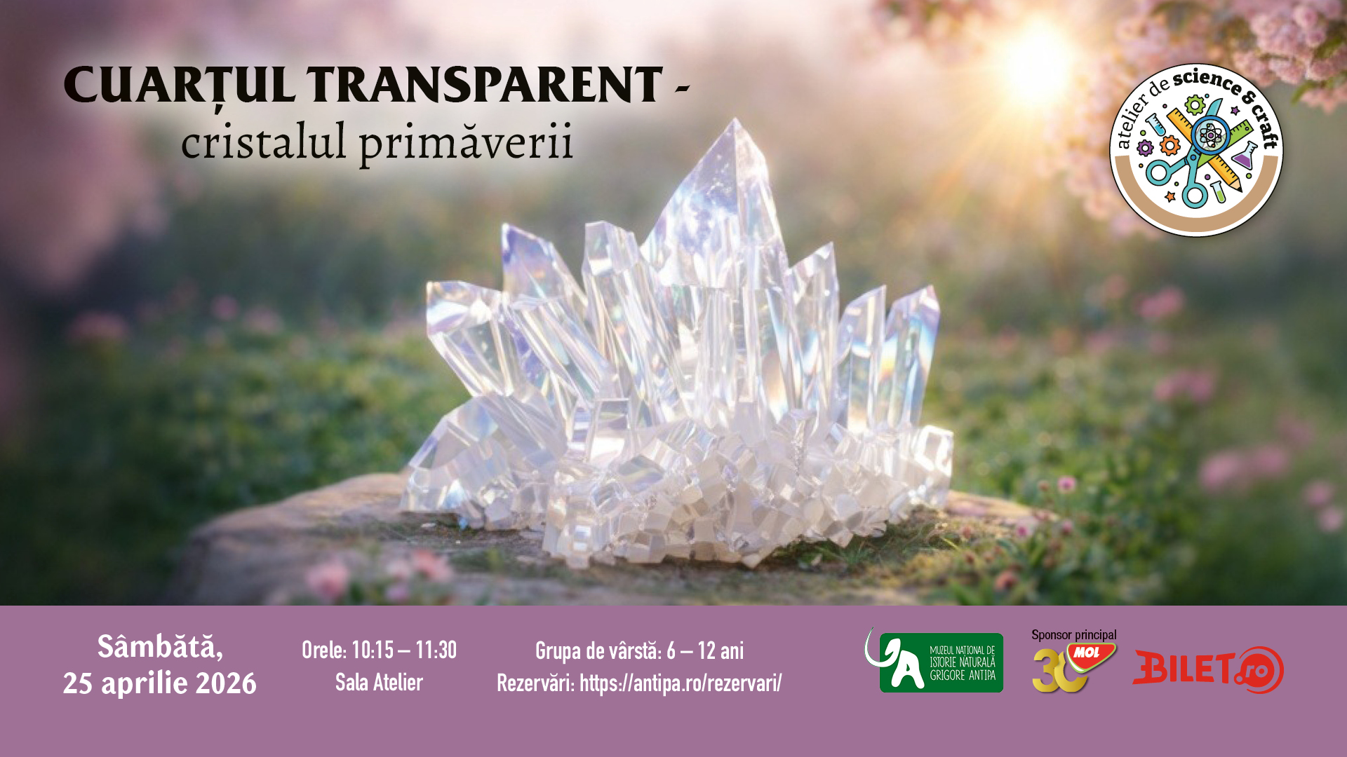 Muzeul Național de Istorie Naturală „Grigore Antipa” îi invită sâmbătă, 25 aprilie, pe copiii curioși să pătrundă în lumea fascinantă a cristalelor, în cadrul atelierului de science & craft „Cuarțul transparent – cristalul primăverii”!