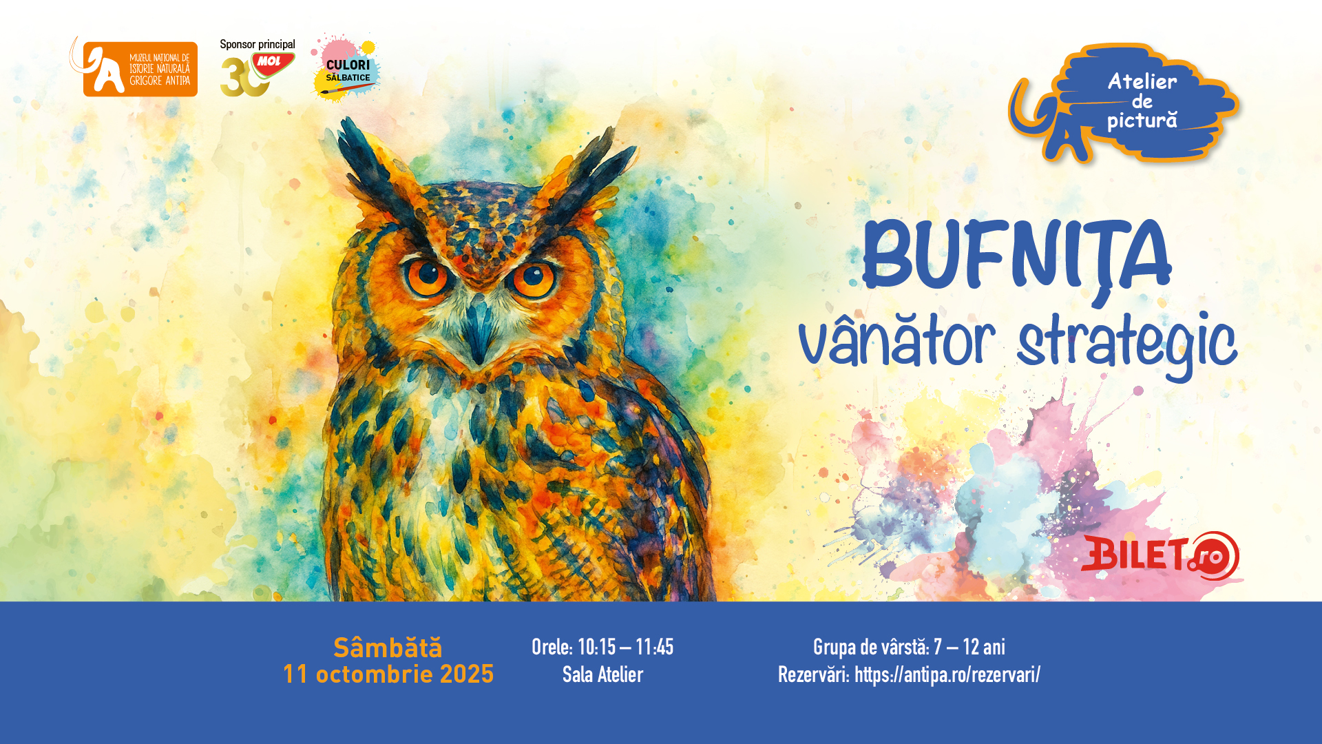 Muzeul Național de Istorie Naturală „Grigore Antipa” îi invită pe copiii pasionați de artă să descopere fascinanta lume a picturii. Bufnița – simbol al inteligenței, vânător strategic, misterios și feroce, va fi personajul principal al atelierului „Culori sălbatice” din această zi.