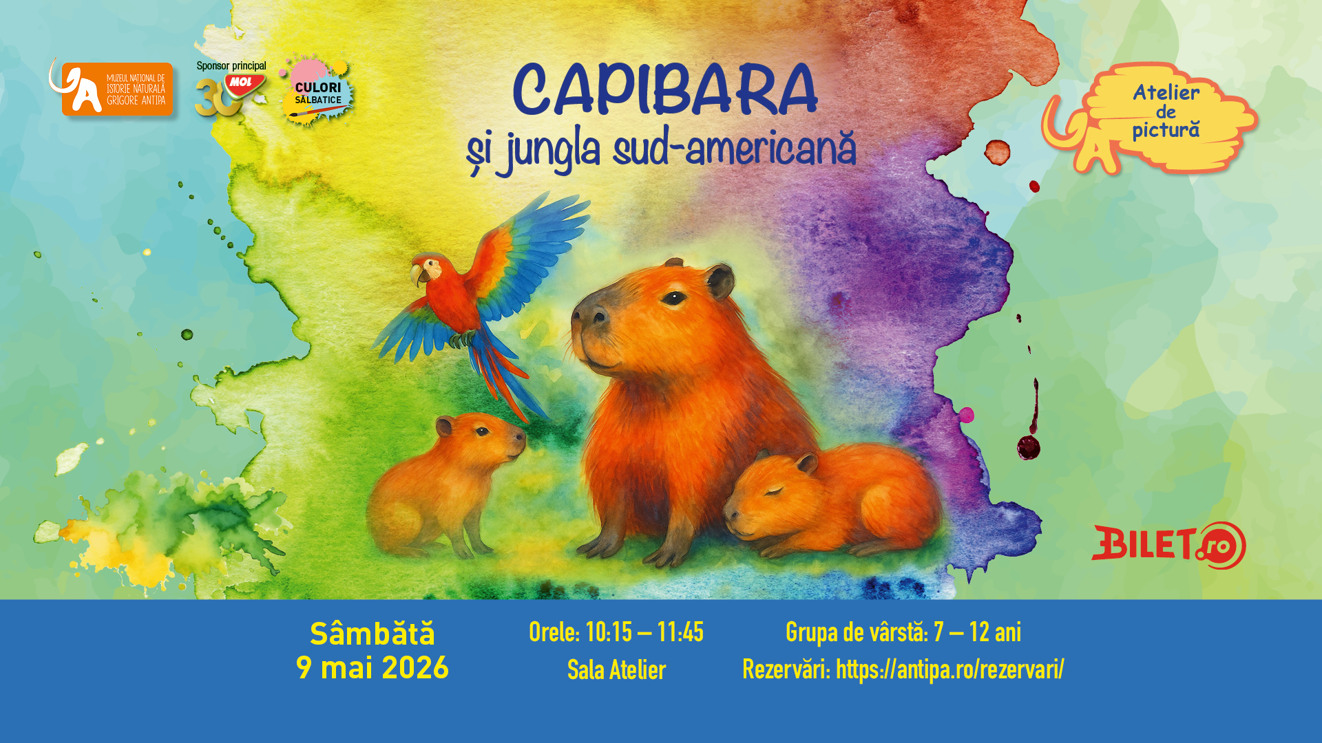 Muzeul Național de Istorie Naturală „Grigore Antipa” îi invită pe copiii pasionați de artă să descopere bucuria picturii în cadrul atelierului „Capibara și jungla sud-americană”. Acest atelier face parte din programul educativ și creativ „ Culori sălbatice”.