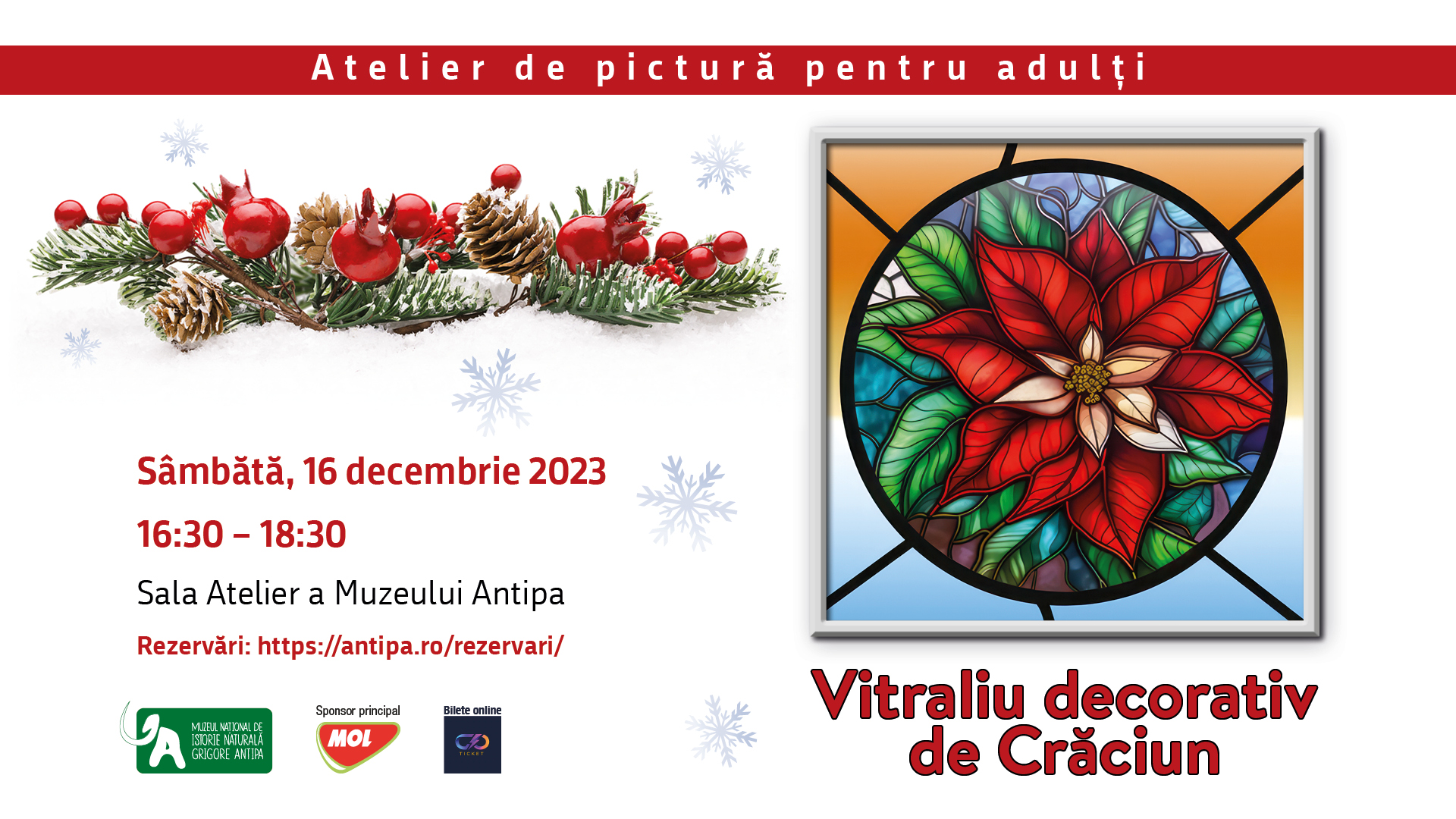 În această perioadă festivă, Muzeul Național de Istorie Naturală „Grigore Antipa” invită adulții care iubesc provocările artistice la un atelier special de pictură tip vitraliu, în care vor descoperi frumusețea și eleganța artei decorative.