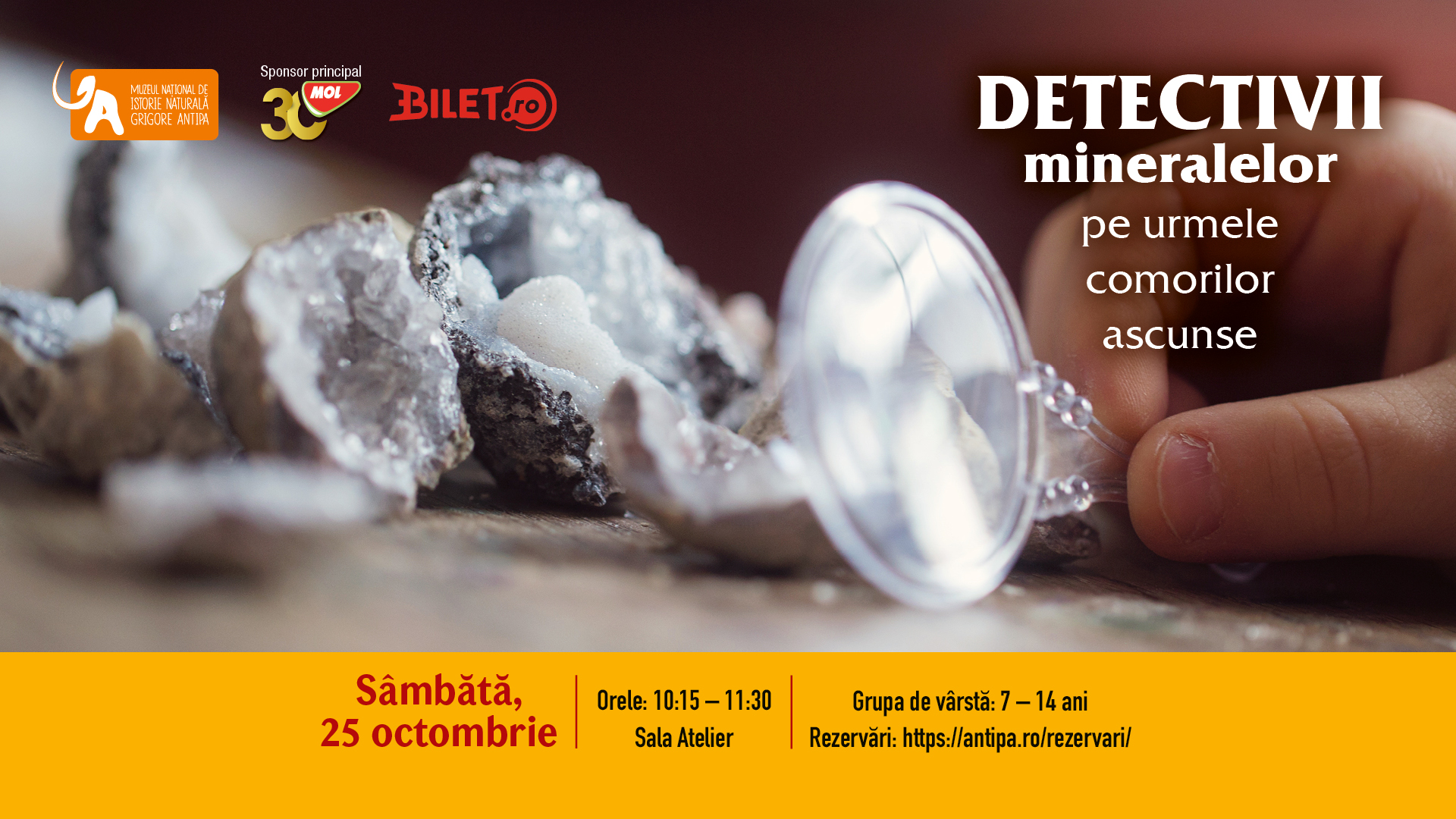 Muzeul Național de Istorie Naturală „Grigore Antipa” îi invită pe copiii cu vârste între 7 și 14 ani la atelierul de science & craft „Detectivii mineralelor – pe urmele comorilor ascunse”, care va avea loc sâmbătă, 25 octombrie 2025, între orele 10:15 – 11:30.