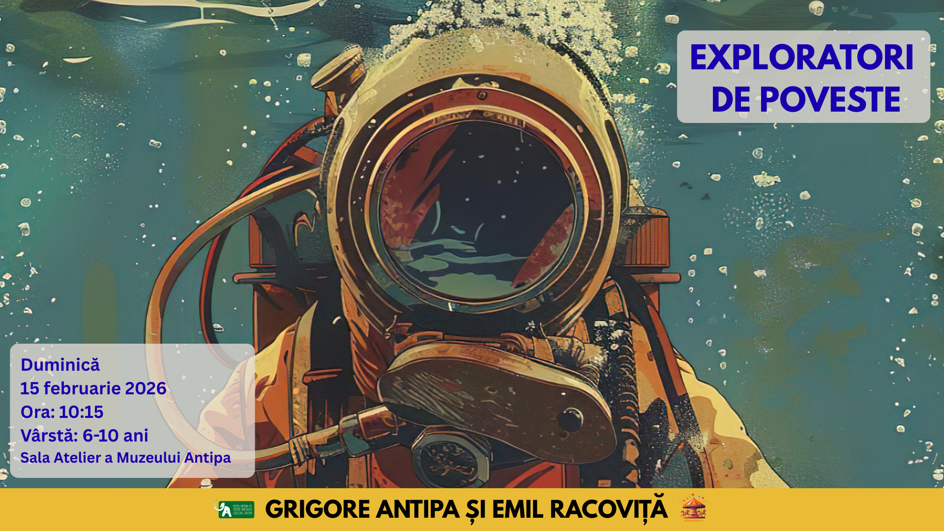 Te așteptăm în lumea exploratorilor Grigore Antipa și Emil Racoviță, pornind de la un detaliu mai puțin cunoscut: cei doi oameni de știință au fost colegi de bancă și au pornit împreună pe drumul cunoașterii. Atelierul se adresează copiilor pasionați de științele naturii (6-10 ani) și îmbină povești, experimente, jocuri senzoriale și elemente digitale care îi vor purta pe cei mici în adâncul mării, în peșteri și păduri, ba chiar și în ținutul înghețat din Antarctica.