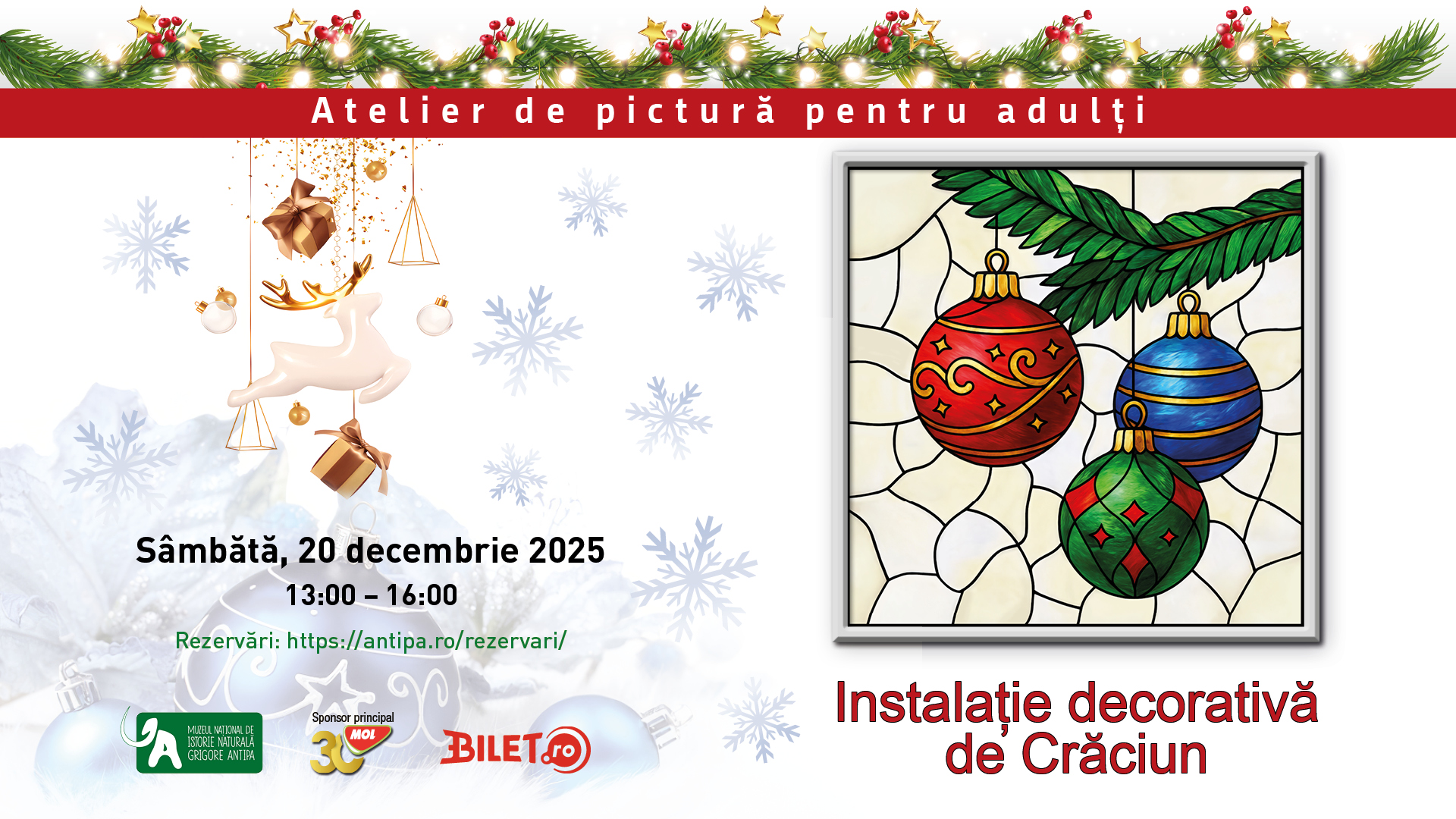 Muzeul Național de Istorie Naturală „Grigore Antipa” vă invită să descoperiți magia sărbătorilor de iarnă printr-un atelier special de pictură, dedicat realizării unei instalații decorative de Crăciun. Participanții vor picta globuri tematice pe un suport transparent cu formă pătrată, transformându-l într-o instalație decorativă spectaculoasă.