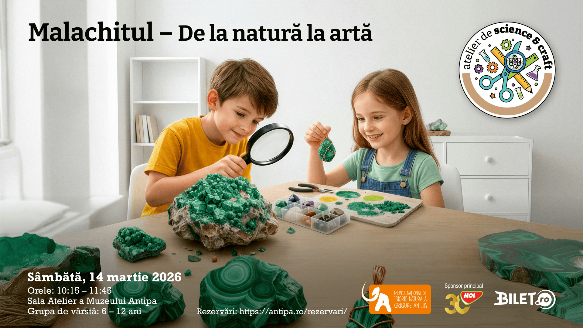 Muzeul Național de Istorie Naturală „Grigore Antipa” îi invită sâmbătă, 14 martie 2026, pe copiii curioși să descopere frumusețea lumii minerale în cadrul atelierului creativ „Malachitul – De la natură la artă”.