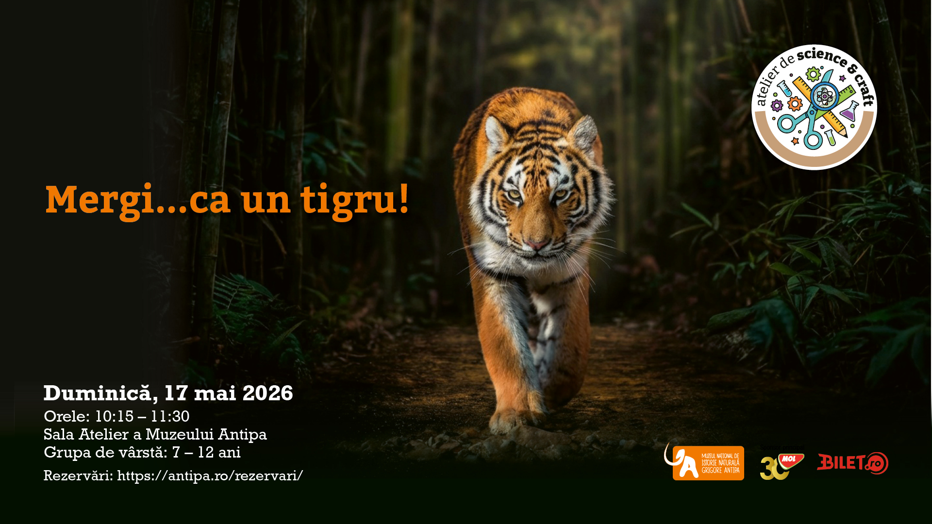 mai 2026, pe copiii cu vârste între 7 și 12 ani la un atelier de science & craft despre o felină puternică și surprinzătoare: tigrul.