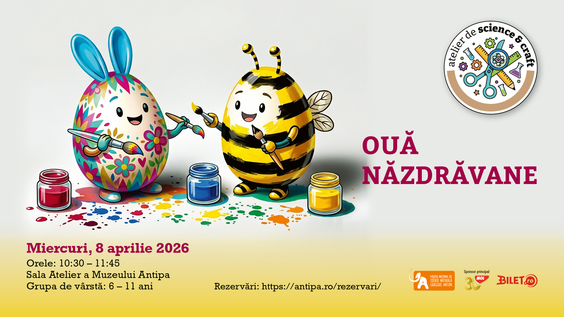 Atelierul se desfășoară miercuri, 8 aprilie 2026, între orele 10:30– 11:45, în sala atelier a Muzeului Antipa.