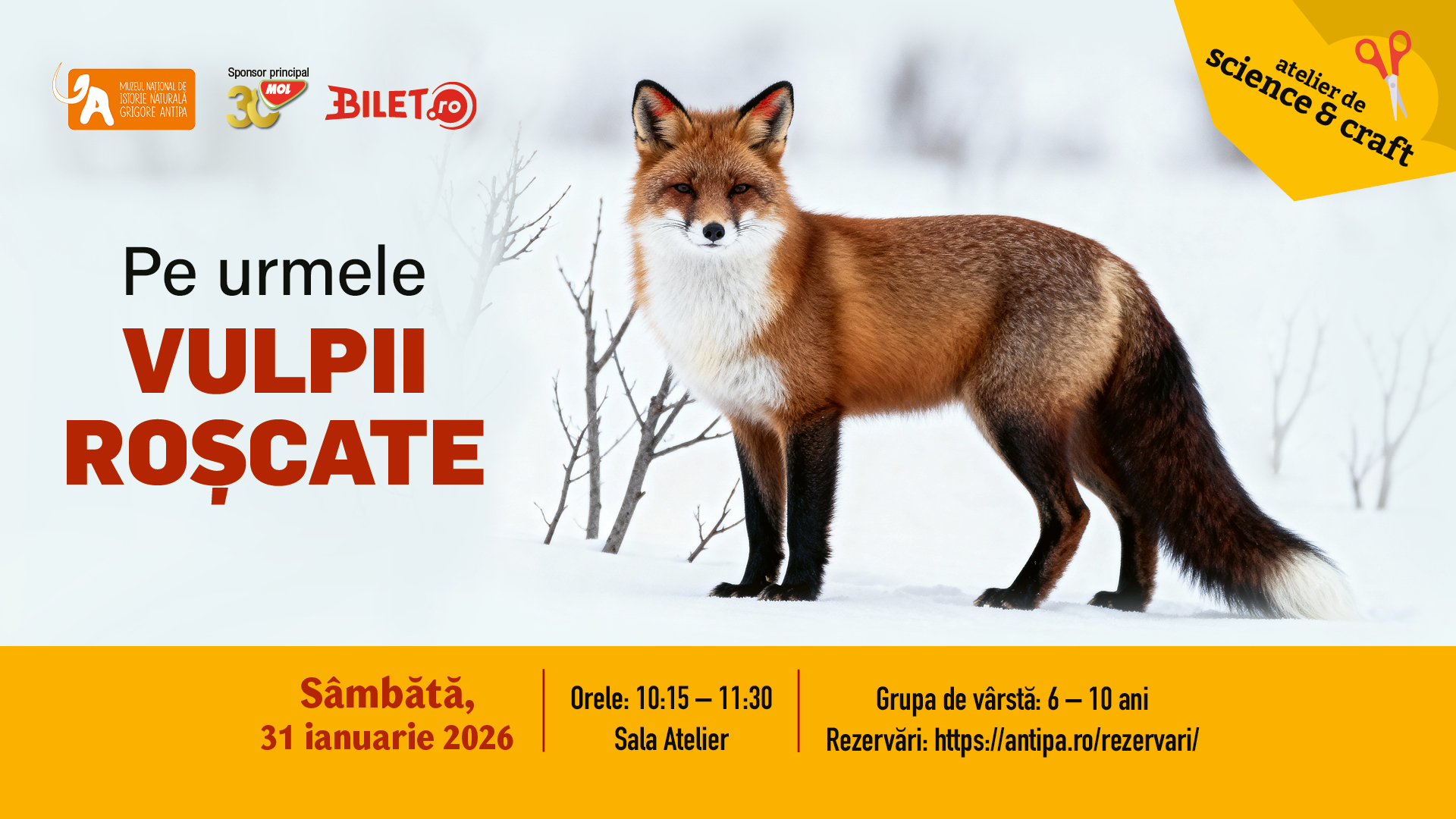 Muzeul Național de Istorie Naturală „Grigore Antipa” invită copiii cu vârste cuprinse între 6 și 10 ani să participle sâmbătă, 31 ianuarie 2026, la un atelier dedicat vulpii roșcate – unul dintre cele mai istețe și adaptabile animale ale pădurii, și nu numai.