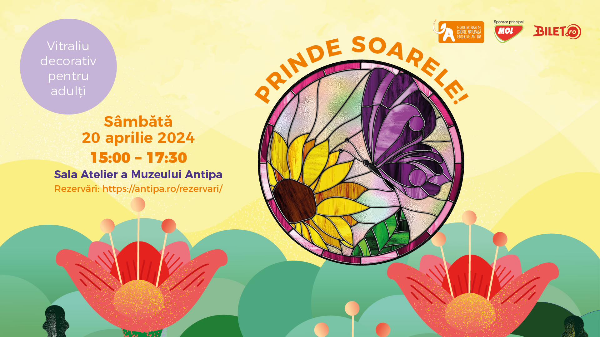 Muzeul Național de Istorie Naturală „Grigore Antipa” invită adulții care iubesc provocările artistice la un atelier special de pictură pe sticlă, în care vor descoperi frumusețea și expresivitatea artei decorative.