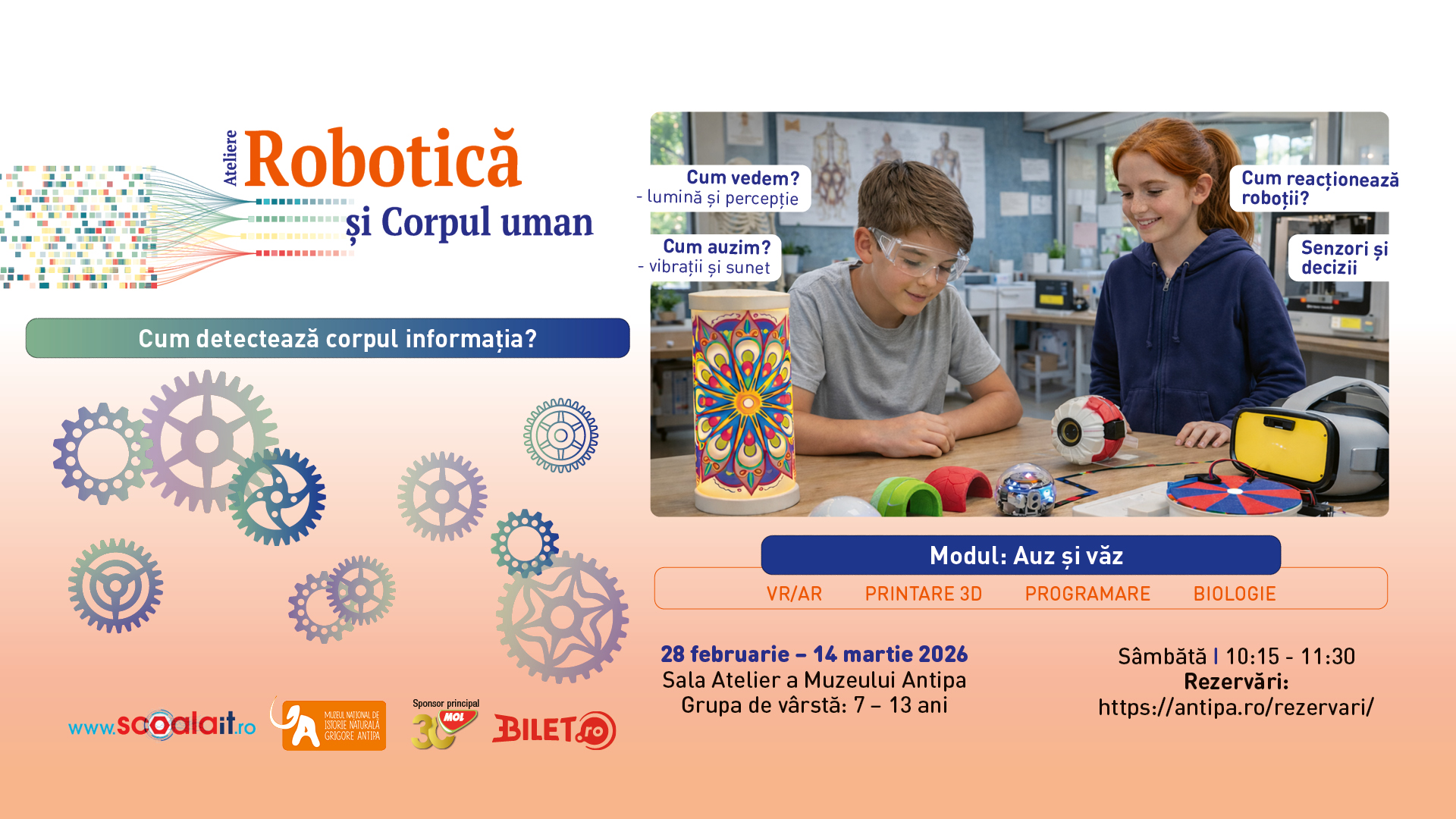 Atelierele de „Robotică și Corpul Uman” se desfășoară Sâmbăta, în Sala Atelier a Muzeului Antipa, între orele 10:15 – 11:30.