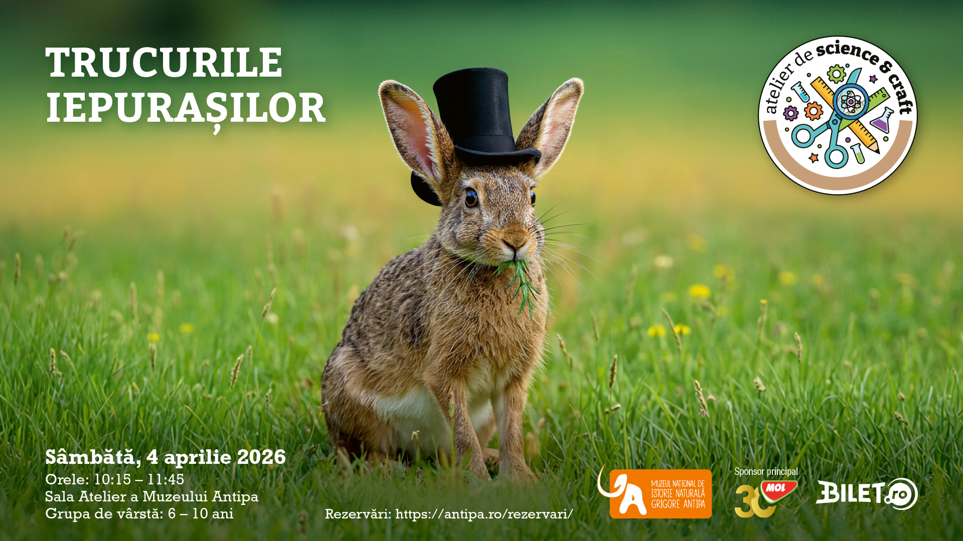 Atelierele se desfășoară sâmbătă, 4 aprilie 2026, în Sala Atelier a Muzeului Antipa, între orele 10:15 – 11:45.